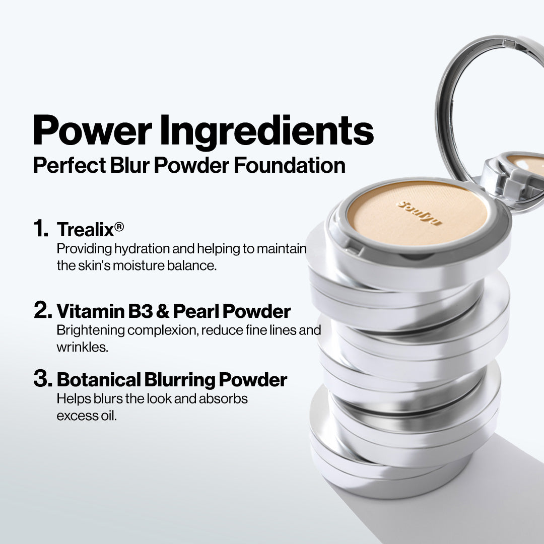Perfect Blur Powder Foundation merupakan bedak foundation yang diformulasikan dengan fine-powder technology yang canggih. Produk ini memiliki tekstur halus yang secara efektif mengisi pori-pori, memberikan efek blur tanpa pori untuk hasil akhir yang lembut dan tahan sepanjang hari. Diperkaya dengan Niacinamide dan Trealix®, kombinasi Trehalose dan Protein Nabati Terhidrolisis, produk ini membantu menjaga dan memulihkan lapisan pelindung alami kulit sekaligus mengontrol minyak dan memberikan hidrasi, menjadikan kulit tampak bercahaya alami.